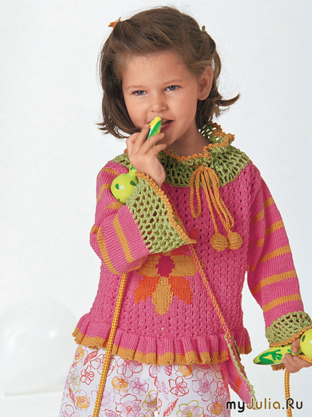 Спинка: желтой нитью набрать 182 (206) 236 п. и связать резинкой для рюша 1 см желтой нитью и 3 см розовой нитью, при этом начать с 6 п. изн. глади и 6 п. лиц. глади (6 п. лиц. глади) 3 п. лиц. глади и 12 п. изн. глади. Через 4 см от наборного края петли закрыть. Связанные лиц. гладью полосы рюша соединить друг с другом так, чтобы поверх связанных изн. гладью полос образовалась складка, и эти складки приметать. Из рюша набрать 62 (70) 80 п. розовой нитью и вязать между кром. узором с дырочками, при этом в 1-м р. вводить спицу в приметанные складки, тем самым их фиксируя. Через 12 (16) 20 см от рюша закрыть для пройм с обеих сторон 1 х 3 п., затем в каждом 2-м р. 1 х 2 и 2 х 1 п. Через 25 (30) 35 см от рюша петли закрыть. Перед: вязать так же, но с цветком и с вырезом горловины. Для этого через 4 (5) 6 см от рюша вязать первые 48 (52) 56 п. от кром. розовой нитью узором с дырочками, цветок по счетной схеме и остальные петли вязать розовой нитью узором с дырочками. Закончить узором с дырочками розовой нитью. Через 19 (24) 29 см от рюша закрыть для выреза горловины средние 20 (26) 32 п. и закончить обе стороны раздельно. При этом в каждом 2-м р. закрыть с края выреза 1 х 4 и 3 х 2 п. На высоте спинки закрыть оставшиеся петли плеча. Рукава: набрать по 50 п. розовой нитью и вязать между кром. полосатым узором. Для скосов рукава прибавить с обеих сторон 6 (5) 6 х 1 п. в каждом 6-м р. и 1 (5) 6 х 1 п. в каждом 4-м р. Через 14 (17) 20 см от наборного края закрыть для оката рукава с обеих сторон 1 х 4 п., затем 1 (2) 2 х 3, 4 (3) 3 х 2, 3 х 1, 2 (2) 1 х 3 и 0 (0) 1 х 4 п. в каждом 2-м р. Через 21 (24) 27 см от наборного края закрыть оставшиеся петли. Сборка: выполнить плечевые швы; втачать рукава, совместив середину рукава с плечевым швом. Выполнить боковые швы и швы рукавов. Нижние края рукавов обвязать крючком светло-зеленой нитью следующим образом. 1-й круговой р.: в каждую 3-ю п. 1 ст. с/н и 1 возд. п. 2-й круговой р.: в каждую возд. п. 1 ст. с/н и 2 возд. п. 3-й – 6-й круговые р.: в каждую арку 1 ст. с/н и 3 возд. п., при этом заменять 1- й ст. с/н каждого кругового ряда на 3 возд. п. и круговой ряд заканчивать 1 соед. ст. в 3-ю возд. п. 7-й круговой р.:вязать пико желтой нитью. Вырез горловины обвязать крючком светло-зеленой нитью 1 круговым р. ст. б/н, затем вязать, как на рукавах, но при этом в 1-м круговом р. выполнить в каждую 2-ю п. 1 ст. с/н и 1 возд. п. Для шнурка связать цепочку из 200 возд. п. желтой нитью и 1 р. соед. ст. Шнурок протянуть в 3-й р. рюша горловины. Выполнить 2 помпона желтой нитью и пришить на концы шнурка. СУМОЧКА Описание работы: набрать 28 п. розовой нитью и провязать лиц. гладью 10 р. розовых, 4 р. желтых, 10 р. розовых, 4 р. светло-зеленых, 10 р. розовых, 4 р. оранжевых, остальные ряды вязать розовой нитью. Через 52 р. от наборного края закрыть для скосов 6 х 2 п. в каждом 2-м р. Затем в следующем 2-м р. закрыть оставшиеся петли. Сложить сумочку изн. стороной внутрь и соединить крючком 1 круговым р. розовой нитью ст. б/н, при этом также обвязать нижний край сумочки. Затем обвязать крючком стороны и нижний край сумочки 1 р. пико светло-зеленой нитью. Клапан сумочки обвязать крючком по 1 р. ст. б/н и пико светло-зеленой нитью, при этом в ряду пико выполнить на мысе клапана петлю для пуговицы (над 3 п. связать 4 возд. п.). Для шнурка связать крючком № 5 двойной нитью (1 розо-вая + 1 желтая) 60 возд. п. и связать 1 р. соед. ст. Концы шнурка пришить к верхним сторонам сумочки. Пришить пуговицу. Рейтинг: +7 Отправить другуСсылка и анонс этого материала б