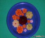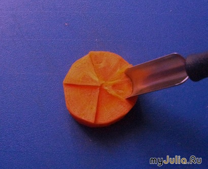 Вырезать его можно не только из моркови, но и из редьки, дайкона, свеклы и других плотных овощей. Нам понадобятся: - морковь, - тайский нож, - овальный нож. 1. Приготовьте заготовку из моркови. 2.От центра моркови сделайте 5 неглубоких надрезов тайским ножом: 2. Надрезы делят морковь на 5 секторов. Положите тайский нож на морковь и срежьте сектор, двигаясь по окружности от одного надреза к следующему надрезу. Кончик ножа держите у центра: 3. Срезав все сектора, вы получите такую заготовку цветка со ступенчатыми лепестками: 4. Отрежьте от моркови заготовку шириной 1 см: 5. Вставьте широкий овальный нож в сектор между двумя "ступеньками", поверните его, чтобы вырезать лепестки. Вырежьте 5 лепестков, соединяя круглые надрезы: 6. Освободите цветок от обрезков, выдавив его снизу вверх из заготовки: 7. Цветок готов! Рейтинг: +7 Отправить другуСсылка и анонс этого материала будут отправлены вашему другу по электронной почте. |