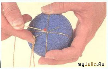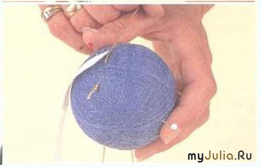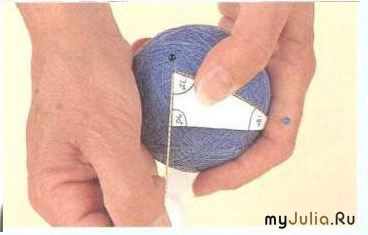 2. Приколите один конец бумажной ленты к шару булавкой с цветной головкой, например красной, это будет верх шара, а с противоположной стороны приколите ее булавкой с черной головкой, обозначив его низ. Обогнув лентой шар, загните и загладьте сгиб. 3. Размотав ленту, загните ее наверх до булавки. Заложите вторую складку – это будет половина длины окружности шара. 4. Загните полоску наверх, чтобы булавки коснулась вторая складка, загладьте. Эта будет средняя линия шара. 5. Теперь соедините первую складку ленты с булавкой и загладьте четвертую складку. Она укажет на середину дуги нижней части шара. 6. Вырежьте ножницами небольшие уголки у основания каждой складки. 7. Снова обмотайте бумажной лентой шар, начиная от красной булавки. В каждый вырезанный уголок воткните булавки с головками разных цветов. Укладывание направляющих нитей. 1. Сделайте угловой шаблон для разметки в случае, если число секторов будет нечетным. Чтобы определить, какой угол должен иметь шаблон, разделите 360 градусов на количество необходимых секторов. Так, при делении шара на 5 секторов нужен шаблон с углом 72 градусов. Транспортиром отмерьте угол нужной величины, вырежьте шаблон и надпишите его. 2. Вденьте в иглу металлизированную нитку для вышивания и завяжите на конце двойной узел. Введите иглу в шар на расстоянии примерно 3 см от верхней булавки и выведите наружу у булавки. Потяните за нитку, чтобы узел оказался под обмоткой. 3. Обмотайте нитку вокруг шара, вдоль всех булавок. Сделайте небольшой стежок у нижней булавки. Наложив шаблон, под нужным углом верните нитку к верхней булавке, обмотайте вокруг нее нитку и снова ведите ее вниз, к нижней булавке. Таким образом разметьте все сектора. Прежде чем вести нитку вверх для разметки последнего сектора, сделайте небольшой стежок через все направляющие, закрепив нитку у нижней булавки. Закончив разметку, закрепите все нити, сходящиеся у верхней булавки. Заправьте кончик нитки под обмотку шара. 4. Если у вас будет четное количество секторов, их можно размечать без шаблона,поровну, на глаз,разделив шар сначала пополам, затем каждую половинку, четвертинку и т. д. Нитки прокладывайте и закрепляйте так же, как описано выше. Рейтинг: 0 Отправить другуСсылка и анонс этого материала будут отправлены вашему другу по электронной почте. |