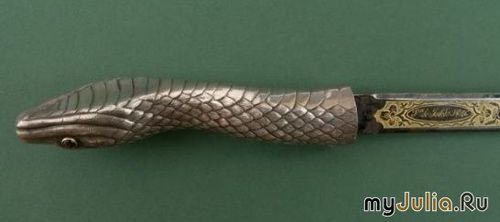 Шпага была изготовлена по специальному заказу для вручения в качестве памятного подарка высокопоставленному лицу. Сворачивающийся в кольцо исключительно гибкий клинок напоминал и заказчикам, и одариваемому лицу о легендарных толедских шпажных клинках XVI - первой половины XVII века, продававшихся в оружейных лавках, будучи свернутыми в кольцо. Серебряная рукоять выполнена в виде передней части туловища и головы ядовитой змеи с глазами-вставками из розового стекла. В нижней части рукояти вмонтирована пружинная защелка, фиксирующая клинок в ножнах. Серебряные ножны изготовлены в виде туловища с хвостом свернувшейся в кольцо змеи. О, моя душа плачет по этому предмету...как хочется такую иметь дома. Обожаю холодное оружие, а это еще выполнено в форме одной из моих любимых рептилий - в виде змеи...Сижу и пускаю слюни... Рейтинг: +7 Отправить другуСсылка и анонс этого материала будут отправлены вашему другу по электронной почте. |