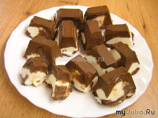 Продукты: 1 стакан творога, 1/2 стакана густых сливок/сливочного масла, 2 ст.ложки фруктозы/сахара, ванилин на кончике ножа, 1/2 стакана шоколадной глазури, фундук. Способ приготовления: взбиваем в мерочном стакане миксера творог, сливки, фруктозу и ванилин до получения однородной массы. В форму для льда или любую другую подходящую форму (например, силиконовую) наливаем тёплую шоколадную глазурь , либо растопленный шоколад, и закладываем творожную массу таким образом, чтобы её со всех сторон обволокло глазурью, кладём во внутрь орехи. Сверху также поливаем шоколадом и ставим для застывания в холод. Если у Вас нет желания долго возиться и ждать, пока сырки застынут, или просто у Вас остались ингредиенты (остатки - сладки) - просто положите в шале или стакан творожную массу, посыпьте орехами и залейте шоколадной глазурью. Рейтинг: +18 Отправить другуСсылка и анонс этого материала будут отправлены вашему другу по электронной почте. |