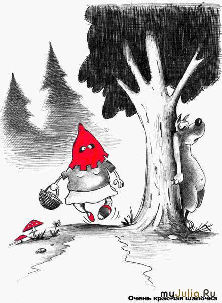 Возле леса, возле речки жил один еврей в местечке Со своей супругой Ривой, жил, как Бог ему судил, И у этой пары дома подрастал сыночек Сёма, Oн всегда, зимой и летом, в красной кипочке ходил. В красной кипочке шелковой, сам начитанный, толковый, Mатеринскою любовью и вниманием согрет. Ой, дэр татэ мыди бэйнэр, ой, а ингэлэ а шэйнэр, То есть, форменный красавец - хоть пиши с него портрет А за лесом, на опушке, в однобедрумной избушке, У глухого буерака, где растёт чертополох, Проживала Баба Роза - жертва остеохондроза, По анкете, между прочим - Роза Львовна Шляпентох. Ой, у бабушки-старушки ни укропа, ни петрушки, Никаких деликатесов, только хлебушка кусок. Были гуси, были шкварки, а теперь - одни припарки, Всё, как в песне: здравствуй, поле, я твой тонкий колосок! Но зато у Мамы Ривы - куры, гуси, вишни, сливы, Гоголь-моголь для сыночка - он на всё горазд и спор: В красной кипочке гуляет и на скрипочке играет, И не просто "чижик-пыжик" - гамму ля-бемоль-мажор! И когда утихла гамма, говорит сыночку мама: "Надо бабушку уважить, как ведётся на Руси. Положи смычок на полку и бери, сынок, кошёлку И кошерные продукты Бабе Розе отнеси." А в кошёлку Мама Рива уложила всё красиво: Фаршированную рыбу с хреном в баночке от шпрот, Яйца свежие в мешочке и гусиный жир в горшочке, Деруны на постном масле и, конечно же, компот.. Вот идёт по лесу Сёма, и тропа ему знакома. Помощь бабушке-старушке - вот его священный долг! В красной кипочке из шёлка он идёт, в руке кошёлка, Ничего не замечает, а ему навстречу - Волк. Волк Иванович Свиридов - из матёрых инвалидов, Пострадал уже однажды, обмануть его хитро: Он был ранен в ягодицу, потому что съел девицу В красной шапочке из сказки Шарля, кажется, Перро. Волк сперва стоит на стрёме, а потом подходит к Сёме, Говорит: "Шолом Алейхем! Что за шухер? Тихо, ша! Ты куда идёшь, пархатый, и чего несёшь из хаты?" И ему на это Сёма отвечает, не спеша: "Мне смешны твои угрозы! Я несу для Бабы Розы Фаршированную рыбу с хреном в баночке от шпрот, Яйца свежие в мешочке и гусиный жир в горшочке, Деруны на постном масле и, конечно же, компот. В предвкушенье пищи сладкой облизнулся Волк украдкой, Говорит он: "Бабе Розе эти яства не нужны. Я всю жизнь по лесу рыщу, обожаю вашу пищу - Фаршированную рыбу и особо - деруны. А компот, в конечном счёте, посильней, чем "Фауст" Гёте, Так что нечего мне баки забивать своей мурой".. "Ни за что я злому Волку не отдам свою кошёлку!" Отвечает Волку Сёма - в красной кипочке герой. Ты, приятель, из аидов, ну а я - из инвалидов, Мне положена диета на гусином на жиру! Что ж ты, красная ермолка, обижаешь злого Волка? Я сейчас пойду и с ходу твою бабушку сожру. Не пойми меня превратно - понесёшь тогда обратно Фаршированную рыбу с хреном в баночке от шпрот, Яйца свежие в мешочке и гусиный жир в горшочке, Деруны на постном масле и, конечно же, компот.." "Ты мне бабушку не трогай - покараю мерой строгой!" - Красной кипочкой качая, Сёма Волку говорит. "Что ж я, вместо Бабы Розы должен есть кору с берёзы?" Очень нагло отвечает этот злобный инвалид, И помчался на опушку кушать бабушку-старушку, По анкете, между прочим, Розу Львовну Шляпентох. Волк - он тоже знанье копит, у него громадный опыт Поедания старушек всех народов и эпох! В это время Роза Львовна (так зовут её условно) На трёхногом табурете восседает у окна. В однобедрумной избушке нет ни крошки, ни горбушки, Оттого-то Б