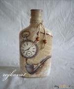 Последнее время очень нравится заниматься декупажем и вот какой подарочек для своего мужчины сделала. Бутылочка от бальзама напоминает фляжку и это натолкнуло меня на мысль Решила сделать такую фляжку, с мужскими атрибутами. Нашла подходящую салфеточку, а у кого есть принтер, можно и распечатку сделать. Сделала декупаж, подробно уж рассказывать не буду. Кому интересно, можно и в группу «Декупаж» заглянуть Для красоты еще веревочку завязала, на концах деревянные бусинки. Подарила любимому, просто так, небольшой сюрприз. Что туда налить мы еще не придумали, он практически не пьет. Но, думаю, коньячок там был бы очень даже к месту