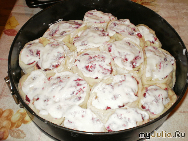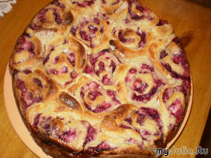 Пирог делаю на дрожжевом тесте.Когда тесто подошло,раскатываю его в пласт и смазываю поверхность растительным маслом.Посыпаю сахаром и выкладываю ягоды. Затем сворачиваю в рулет и нарезаю на равные части. Готовые рулики кладу в круглую форму для выпечки,дно которой покрыто бумагой для выпечки,а края формы смазаны маслом. Верх пирога смазываю сметаной.И даю немного постоять,что бы тесто поднялось. Выпекаю до румяной корочки. Всё,готово! Приятного аппетита!