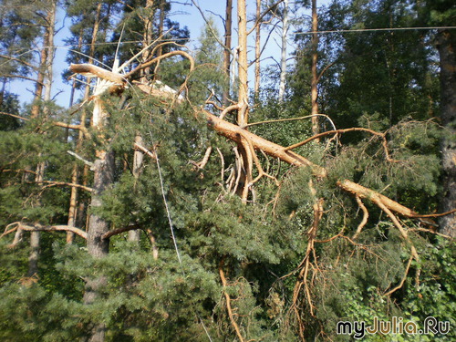 Нынче в сосновом бору (за грибами ездили) такую же картину наблюдала. Сосны в одном направлении положены друг на друга полосой метров двадцать, не меньше. Корневища вверх, земля еще не обсохла. Страшное зрелище! А рядом как ни в чем не бывало стоят другие сосны.