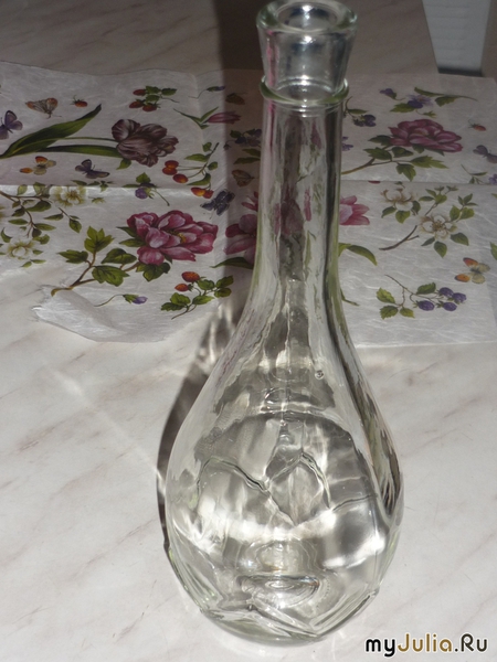 Начинаем, как всегда, с обработки поверхности бутылки ацетоном или спиртом. Здесь на заднем плане как раз виден лист рисовой бумаги с нанесенным на неё рисунком. Далее просто отрываем от бумаги кусочки с фрагментами рисунка и приклеиваем на бутылку. Делать это лучше так - смешиваем клей ПВА и воду в соотношении 1:1, т.е. одна часть клея, такая же часть воды. Кисточкой наносим на бутылку клеевой состав, берем сухой (!) фрагмент бумаги, прикладываем к бутылке, сверху кисточкой замазываем клеевым составом. Следующий фрагмент приклеиваем с небольшим нахлестом на предыдущий фрагмент, пустоты запоняем кусочками рисовой бумаги без рисунка. За счет волокон на рисовой бумаге, места где один фрагмент наползает на другой совсем не видны. Так оклеиваем всю бутылку и даем высохнуть. Теперь вся бутылка - белая с цветами. Можно оставить так и перейти сразу к этапу покрытия лаком, а можно немного придать рисункам объема и нанести разноцветные тени пастелью. Вокруг синих цветов - синеватая пастель, вокруг красных- красноватая или оранжевая, кое где желтые блики, а возле листиков - зеленые блики. Пастель наносим так - пальцем трем вначале пастель, а потом этим окрашенным пальцем трем бутылку в нужном месте , при этом пастель с пальца перходит на поверхность бутылки, создавая блик. Далее покрываем бутылку лаком (акриловым) , лучше 2-3 слоя. Даем высохнуть и сверху наносим контурами точки - в серединках цветов, на крыльях бабочек, по горлышку бутылки Когда всё высохнет , бутылка готова - в неё можно ставить цветы и любоваться - живым и рукотворным. Успехов!