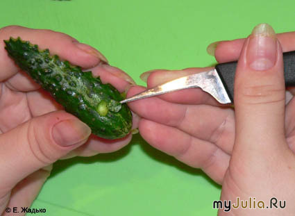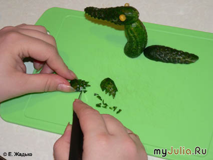 1-й вариант Вам потребуются: - 2 огурца (один прямой, а другой изогнутый); - кукуруза; - длинный нож; - тайский нож; - малый треугольный карбовочный нож; - нуазетка; - зубочистка. 1. Возьмите прямой огурец и разрежьте его по диагонали, отступив от края 1-1,5 см. 2. На одной из половинок по всей длине карбовочным ножом прорежьте зубы. 3. Нуазеткой диаметром 1,5 см вырежьте полусферу в широкой части головы. 4. Тайским ножом вырежьте глазницы. 5. Вставьте в глазницы зерна кукурузы. 6. Соедините голову с туловищем (изогнутым огурцом) с помощью зубочистки. 7. Соедините туловище с хвостом (второй половинкой прямого огурца). 8. Тайским ножом из кожуры огурца вырежьте 2 лапки. 9. Приложите лапки к туловищу крокодила. 2-й вариант Вам потребуются: - 2 огурца; - кукуруза или маслины; - длинный нож; - малый треугольный карбовочный нож; - тайский нож; - бигуди. 1. Возьмите длинный огурец и нарежьте из него спираль с помощью бигуди. 2. Тайским ножом вырежьте лапки из кусочков кожуры огурца. 3. Второй огурец срежьте по диагонали, отделив 1/3 огурца. 4. Длинным ножом на меньшей части огурца прорежьте пасть крокодилу. 5. Карбовочным ножом сделайте зубы - надрезы по всей пасти крокодила сверху и снизу. 6. Тайским ножом вырежьте глазницы. 7. В глазницы вставьте зерна кукурузы и приложите голову к туловищу, из оставшейся части огурца сделайте хвост. 8. Приложите хвост к туловищу. 3-й вариант Вам потребуются: - 2 длинных огурца; - кукуруза; - длинный нож; - тайский нож; - малый треугольный карбовочный нож; 1. Возьмите часть огурца со стороны цветка длиной 6-8 см. Длинным ножом прорежьте пасть крокодила. 2. Тайским ножом сделайте глазницы. 3. Карбовочным ножом сделайте зубы по всей пасти крокодила сверху и снизу. 4. На носу тайским ножом сделай диагональные надрезы слева направо и справа налево. 5. Второй огурец нарежьте кольцами диаметром 6-7 мм. Приложите их к голове. 6. Из остатков первого огурца сделайте хвост. 7. Вставьте зерна кукурузы в глазницы, приложите к туловищу хвост. Тайским ножом вырежьте лапы: задние более длинные, передние более короткие. 8. Приложите лапы к туловищу. Вместе крокодильчикам весело!