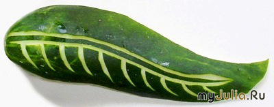 Вот я думаю, может, у меня руки не заточены делать карвинг? Посмотрю на картинки, полюбуюсь на мастер-классы. Вроде все просто, бери тоненький ножичек, главное, чтобы поострее, и действуй!Действую, только все у меня не так и все не эдак. Например, чего проще, сделать листик из огурца? Вырезал контур из огурца. Вычистил мякоть практически до кожуры. Вырезал посередине заготовки полосочку. Все понятно, бери и "рисуй" на огурце листик ножичком. Вот сотворила букетик из того, что было под рукой. Цветочек из горького перца, оранжевый листик из моркови и зеленые листики из огурца. Не ругайте меня сильно за косорукость. Рейтинг: +18 Отправить другуСсылка и анонс этого материала будут отправлены вашему другу по электронной почте. |