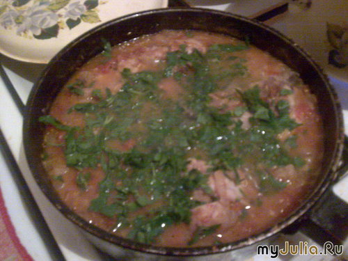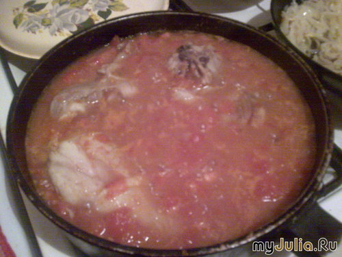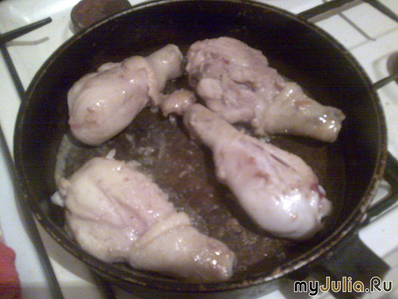 Мужчина на кухне... Наверное это мечта многих русских женщин: прийти вечером домой, а стол накрыт к ужину блюдами, приготовленными руками мужа...Вот и я мечтаю о том же, и мы с моим любимым мужем потихонечку движемся к этой моей мечте. Вчера, придя с работы домой я обнаружила на столе вот такой набор продуктов. Муж торжественно объявил, что выбрал в интернете рецепт чахохбили, закупил необходимые ингредиенты и сейчас будет готовить это таинственное грузинское блюдо. Ура!!! Значит мне не придется сегодня стоять у плиты. Я смогу посидеть в интернете или перед телевизором. Приступай, дорогой! Но я буду не я, если не прослежу, как же идут дела у мужа на кухне, если не поправлю его, увидев, что он делает не по-моему. В результате я оказалась на кухне с фотоаппаратом и ножом одновременно. Нет-нет-нет, не подумайте ничего плохого, я взяла нож, чтобы помочь своему кулинару. Ну а фотоаппарат для увековечивания кулинарного произведения в его исполнении. Итак, куриные голени были выложены на сухую сковородку обжариваться на 15 минут. Помидору залили кипятком, чтобы снять с нее кожицу, и муж отважно приступил к этому процессу. Он доставал из горячей воды помидорку и, обжигаясь, очищал ее. Периодически ему приходилось отворачиваться от стола к плите (благо, что кухня мизерная и поворота этого достаточно), чтобы перевернуть голени на сковороде. Я наблюдала этот процесс, и у меня чесались руки что-нибудь почистить или порезать. Что поделаешь, привычки кухарки (а мы, женщины, в большинстве своем кухарки) не дают мне смотреть просто так на приготовление пищи. Поэтому я взяла нож и начала чистить и резать лук. Порезав его кольцами, выложила в сковороду обжариваться. Теперь мы оба крутились вокруг плиты, он резал очищенную помидору и периодически переворачивал куриные голени, я перемешивала лук, следя, чтобы не подгорел, и фотографировала. За 15 минут обжарки мяса была почищена и порезана помидора. Теперь время присоединить ее к мясу и дать им пообщаться минут 10. А лук еще обжаривается. Через 10 минут в компанию мяса и помидоры попросился лук. Их дружба продолжалась 30 минут. Пока они дружили на небольшом огне, мой дорогой кулинар принялся за зелень и чеснок. К сожалению, той зелени, которая должна быть в настоящем грузинском чахохбили, в нашем городке не нашлось, поэтому пришлось использовать обычную петрушку, а для придания настоящего вкуса использовали специи для шашлыка, которые хранились у меня в шкафу. Муж хотел использовать и зеленый лук, но я не посоветовала, так как лука репчатого в блюде уже достаточно. Ну, а чеснок был успешно почищен и раздавлен чеснокодавкой. Через 30 минут к компании, булькающей на сковороде, присоединились соль, чеснок, петрушка и сухие приправы из пакетика для шашлыка. Туда же отправился молотый красный перец. Все вместе они тушились 5 минут. А затем были закрыты крышкой и отодвинуты в сторону, чтобы настаивались и не мешали приготовлению гарнира. А какой же гарнир выбрать? Риса у нас не оказалось, макароны надоели, гречку муж терпеть не может. Осталось картошка. Решили приготовить картофельное пюре. И вот еще через 30 минут на стол было поставлено блюдо с чахохбили. А затем разложенное по тарелкам картофельное пюре наполнилось вкусом и ароматом этого чудесного блюда. Ну и зеленый лучок пригодился картошку посыпать. Вот так моим мужем был п