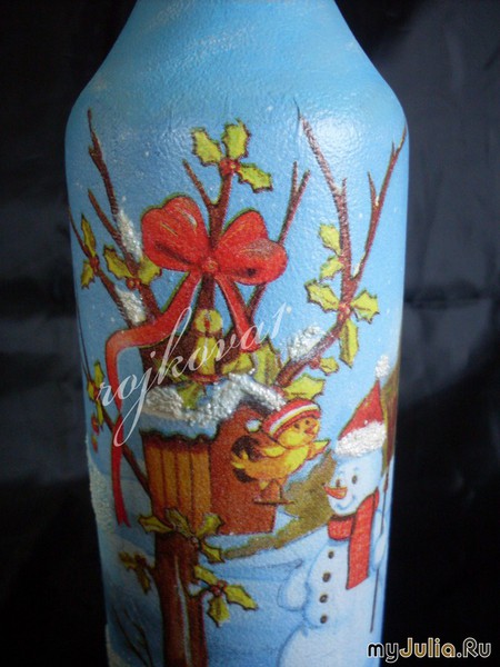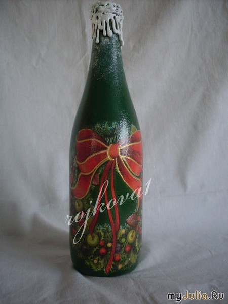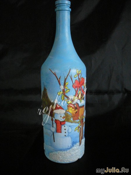 На бутылочке со снеговиком сделала объемные сугробы, манка на ПВА. Еще снег на веточках и на шапочке снеговика. Сверху покрасила перламутровой краской, чтобы переливался снежок. А это бутылка из-под шампанского. На горлышке "сосульки" делала горячим силиконовым клеем, покрасила белой акриловой краской. По краю банта золотой контур. Рейтинг: +37 Отправить другуСсылка и анонс этого материала будут отправлены вашему другу по электронной почте. |