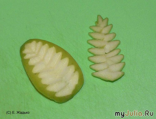 Вам потребуются: - яблоко, - длинный нож, - треугольный нож (резать можно ножом любого размера, но аккуратнее получаются листики, если взять малый или средний нож). 1. Длинным ножом разрежьте яблоко на 4-6 частей (6 – если яблоко большое). 2. Взяв четвертинку, одним движением срежьте мякоть со стороны срезов. 3. Тайским ножом придайте четвертинке яблока вид треугольника. 4. Со стороны кожуры по центру листика прорежьте неглубокую линию тайским ножом (если сделать глубокую, листик может развалиться у вас в руках после вырезания жилок). 5. Жилки начинайте вырезать треугольным ножом от вершины треугольника, отступив немного от края. 6. Далее режьте все жилки справа, вводя нож чуть ниже предыдущего среза и направляя его острие к намеченной тайским ножом линии. 7. Точно так же прорежьте жилки слева. 8. Снимите мякоть над жилками – это уже похоже на листик. 9. Отступив 2-3 мм от края, тайским ножом обрежьте мякоть вокруг жилок. 10. Чтобы яблоко не потемнело, положите листик в подкисленную лимонным соком или лимонной кислотой воду. 11. Перед использованием достаньте листики из воды – они уже не потемнеют. Рейтинг: +19 Отправить другуСсылка и анонс этого материала будут отправлены вашему другу по электронной почте. |