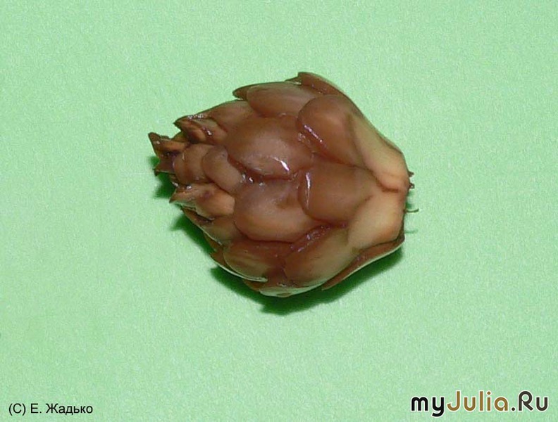На мой взгляд, эту шишку вырезать сложнее, чем еловую шишку http://www.myjulia.ru/post/316074/ Но если вы уже освоили вырезание розы из репчатого лука http://www.myjulia.ru/post/295005/ то больших проблем не должно быть… Вам потребуются: - вытянутая луковица с толстой «талией», - тайский нож, - 2 чайные ложки растворимого кофе (я брала Nescafe), - скрепка. 1. Кофе залейте стаканом кипятка, а затем начинайте вырезать шишку. Очистите луковицу и со стороны донца вырежьте чешуйки шишки в виде вытянутых полуовалов. Ширина чешуек – 8-10 мм. Полуовал надо вырезать одним движением. 2. Удалите чешуйки луковицы над надрезами. 3. Последующие ряды режьте такими же полуовалами, как и первый ряд. При этом не обязательно новые чешуйки должны попадать строго между предыдущими. По мере приближения к листьям лука уменьшайте ширину и длину чешуек шишки. 4. Опустите шишку в слегка остывший кофе. 5. Часа через три шишка станет слегка золотистой, но густой цвет она приобретет только дня через два-три. 6. Скрепку разверните. Тайским ножом на донце луковицы сделайте глубокий надрез и вставьте в него широкую часть скрепки. Узкая часть скрепки будет отличной петлей, с помощью которой шишку легко закрепить на веточке сосны. Рейтинг: +21 Отправить другуСсылка и анонс этого материала будут отправлены вашему другу по электронной почте. |