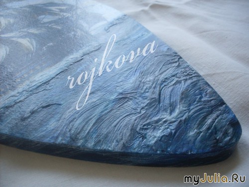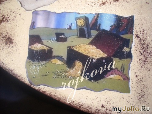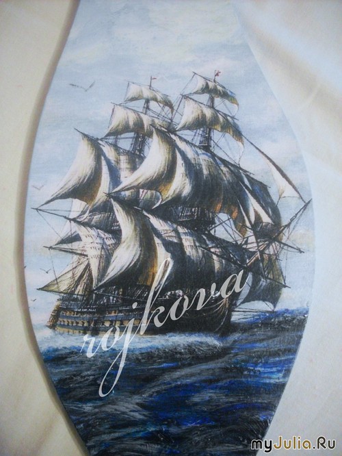 "В синем море..." по мотивам одноименного мультфильма. Фрагменты мультика и песни распечатаны на принтере. Белая бумага чуть-чуть состарена кофе, края обожжены. Добавила чуть золота полусухой кисточкой. "В поисках Немо" И самая шикарна доска "Корабль". Получилась прямо как панно Картинка распечатана на принтере, небо и море дорисовывала акриловыми красками, объем - шпатлевкой.