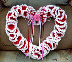 * толстая пряжа двух цветов (красная и белая); * крючок №3; * кусок пенопласта (30*30) или флорформа в виде сердца; * канцелярские булавки (стальные с маленькими шариками). Выполнение работы 1 ряд. Начинайте вязать красной нитью. Наберите 231 воздушную петлю и провяжите 1 столбик без накида во вторую воздушную петлю от крючка. Далее вяжем в каждую воздушную петлю по 1 столбику без накида. Всего получится 230 петель. 2 ряд. Повернув вязание, провяжите 2 воздушные петли подъёма. Далее вяжем по 3 столбика с накидом в каждую петлю предыдущего ряда. Должно получится 690 петель. Повернём вязание. Сменим красную нить на белую. 3 ряд. *3 воздушных петли, столбик без накида. Вяжем от * до конца ряда. В результате получаем тесьму - оборку. Если нет флорформы , вырезаем сердце из пенопласта. Укладываем тесьму зиг - загом на "сердечную" заготовку из пенопласта, закрывая всю поверхность и закрепляя булавками. ![]() Верхнюю часть сердца можете украсить цветком из атласной ленты и бантиками из узких атласных тесёмок. ![]()