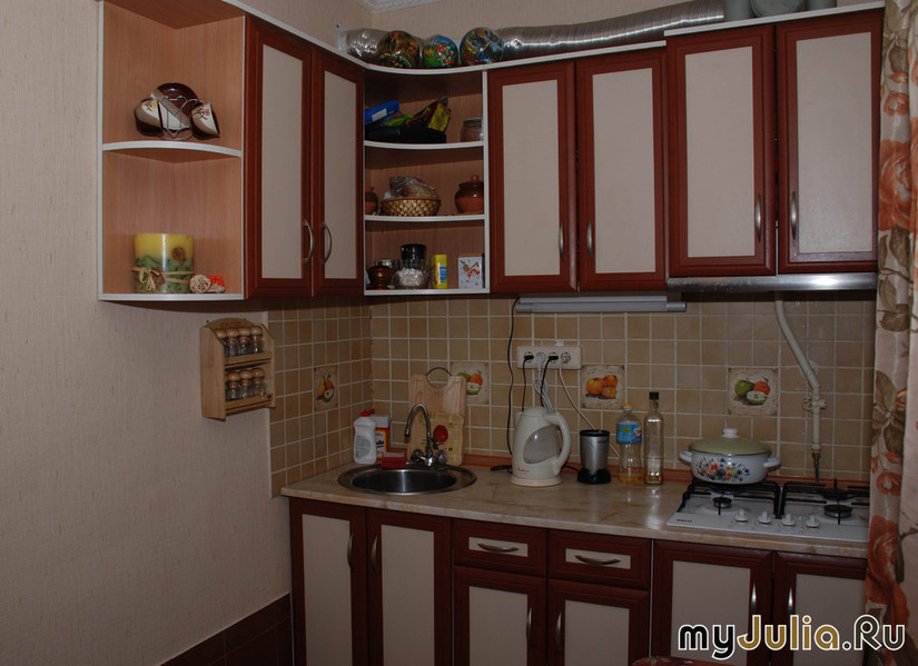 А на кухне верхний шкафчик не стала бы "угловать", все равно он открытый, не слишком функциональный. А просто прямо, как и внизу, и со стеклянными, может, дверцами. Выглядело б еще просторнее! Внизу кухня понравилась - все аккуратненько под одну столешницу!