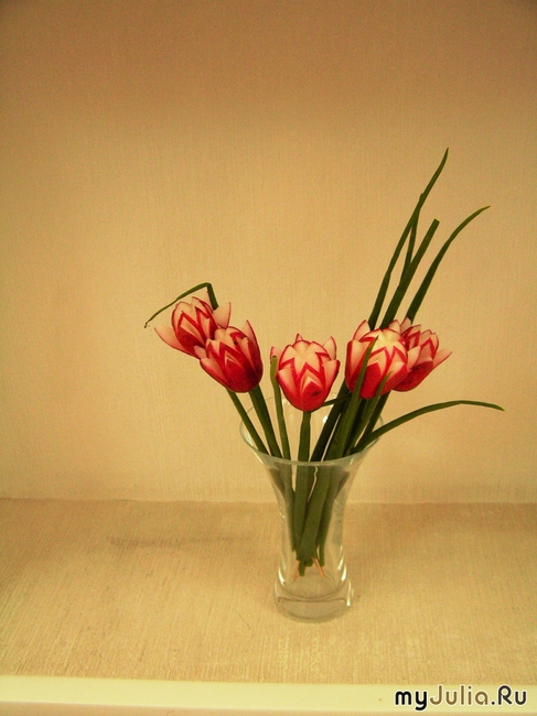 Итак, берем редиску, желательно длинненькую, круглую тоже можно, но это будут не совсем тюльпаны. Убираем остатки стебля и делаем 3 "желобка", чтобы получилась снежинка. Теперь, отступив от снежинки 1,5-2 мм, надрезаем лепестки - делаем вертикальные надрезы примерно на 2/3 высоты редиски. Мы пробовали резать лепестки большим треугольным ножом, получается намного быстрее, но если резать тайским, лепестки будут гораздо изящнее. Как всегда, редис опускаем в воду, чтобы цветы раскрылись. Такими цветами можно украсить тарелку, салат, но лучше всего они смотрятся в букете.