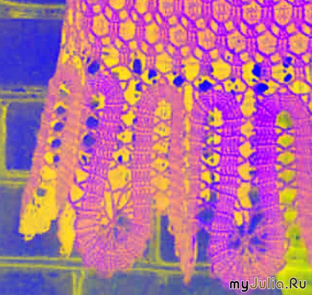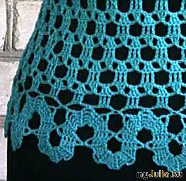 Ушло на него 550 г пряжи COCO (100% мерсеризованный хлопок, 50г/240м)... Вязала крючком №2 Так он выглядит... Не пугайтесь..., просто я не сделала фото фрагмента каймы юбки, поэтому, чтобы можно было разобрать на фото что и как связано..., пришлось немного поизголяться над изображением... Хочу еще сказать что юбку и кофточку вязала сверху вниз... Для юбки начальную цепочку узора вяжите послабее..., более толстым крючком..., чтобы вы смогли свободно влезть (юбка, так же как и кофточка вяжется без швов..., по кругу..., с поворотами в каждом ряду)... Вверху продергивается шнурок... При вязании кофточки, сначала вяжется воротник-стойка, а затем непосредственно от неё вяжется полочка и спинка до начала проймы (спинка длиннее полочки)... На фотографиях видно сколько я рапортов и сколько рядов вязала... И ещё... Для расширения юбки книзу, а также по линии груди и бёдер у кофточки, я использовала следующий приём... В основном узоре увеличивала число воздушных петель с 4-х до 6-ти и с 2-х до 3-х соответственно... Ну вот..., вроде бы все секреты раскрыла... Удачного и приятного вам вязания...!