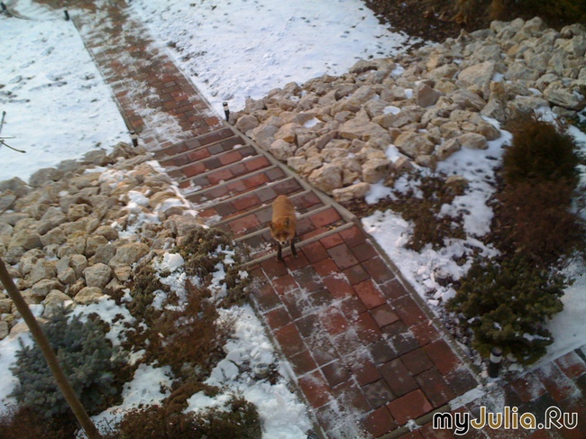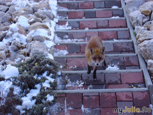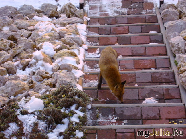И вдруг поднимает голову вверх (видимо меня почувствовала рыжая морда!!’ ’ ) И смотрит так жалобно на меня, ну вроде как говорит: "подайте голодной лисичке на пропитание!! " ![]() Прониклась я к ее просьбе, пошла посмотреть, что в холодильнике у нас завалялось. Нашла равиоли, которые никто кушать не хотел , ну и пару ножек куриных нашлось. Сначала бросила равиоли (на пельмени похожи, только гораздо хуже). Лиса понюхала их, но есть не стала!!!!’ ’Они на фотке на второй ступеньке справа в углу виднеются. Видимо действительно несъедобные !!! ’