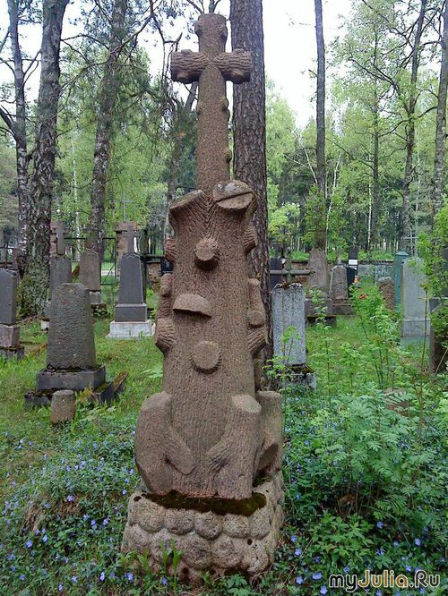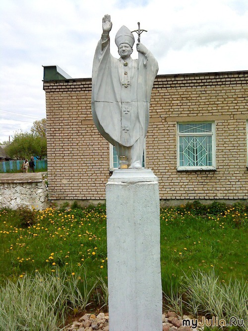 Вообще Раков – недаром имеет статус деревни – маленький. Здесь всё расположено недалеко друг от друга. Поэтому пройдясь немного по улице, мы выходим на костёл Матери Божьей Руженцовой и Святого Доминика. Его основание датируется концом мая 1904 года, окончание строительства – 1906 годом. Камень с памятной датой основания костёла заложен в его фундаменте: Костёл, безусловно, является архитектурной и смысловой доминантой Ракова, определяет силуэт и структуру этого местечка. Здание построено из желтого кирпича в стиле неоготики. Здание само по себе очень высокое и хорошо просматривается практически из всех точек города. Вид со стоянки древнего человека: Нам повезло. Был воскресный день и шла служба, поэтому мы смогли зайти во двор. В сам костёл не заходили, потому что посчитали, что любопытствующим в таких местах не место. В такие места заходят по зову сердца. Но тем не менее то, с чем мы ознакомились во дворе костёла, весьма впечатлило. Смогли поближе рассмотреть витраж на стене: Памятник Иоанну Павлу Второму, который был причислен к лику святых: И высокий крест – памятку Святых Миссий - общих молитв, в том числе экуменических, прошедших в Ракове в мае 2006 года. На дверях костёла висит ящик для писем, и несколько расписаний: занятия для детей, праздничные мероприятия и время ежедневных молитв и воскресных служб с приглашением на совместную молитву. Даже указан мобильный телефон ксёндза. Такая налаженность работы вызвала большое уважение. Особенно когда по окончании службы из костёла начали выходить люди – преимущественно молодежь. Ограда костёла сооружена каменной кладкой, где-то она заметно старая, где-то уже отреставрирована. В костельную ограду вмурован камень с таинственными знаками. Одни утверждают, что это рунические письмена, другие – что это обыкновенная мистификация. Но так или иначе, кто-то тоже весьма старательно пытался и его «отреставрировать». На мой взгляд, получилось это очень плохо: Возле костёла тоже находится памятный знак – ствол дерева (из всех видов обработки древесины на нём только снята кора) с вырезанным наверху крестом: Вообще дерево у католиков находится в большом почитании. На католическом кладбище, расположенном при въезде в город со стороны Минска, мы находим множество памятников, выполненных из камня «под дерево»: Также интересно то, что наряду с деревом используется символика грибов: А вот просто каменный крест, вырубленный «под дерево»: Здесь же, на кладбище, находится другой костёл – Святой Анны, возведённый в 1830 году: Со всех сторон, кроме фасада, он окружён захоронениями: Католическое кладбище уникально своими надгробными памятниками. Здесь находятся как очень старые (наверное, со времён возведения костёла) памятники: так и более свежие, но не в таком хорошем состоянии вероятно, по причине их заброшенности: Вообще кладбище очень чистенькое, аккуратное, посещаемое людьми. Даже имеются свежие, совсем недавние захоронения. Но некоторые зоны уже отмечены печатью упадка – видно, за этими могилами следить больше некому: А это – прямо как воззвание из земли: Обращая внимание на стилистику оформления католических надгробных памятников, мы обращаем внимание на то, что изображения умерших встречаются изредка только на новых памятниках, в основном же, и на старых надгробиях, - только крест и (или) образ 