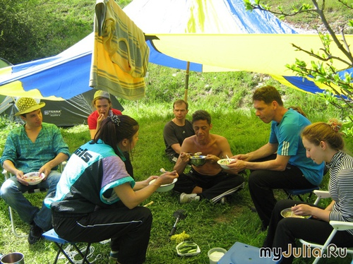 Может, семинар нужен нам ради того, чтобы каждый нашел свой предел? Для одного сама поездка туда - уже достижение, другой дорвался до тренировок и с упоением совершенствуется.. А третий пробует потихоньку и прислушивается к себе - как там старые раны, не ноют? Нет? Значит, еще капельку добавим.. Терпимость и уважение к другому, желание помочь и стремление не навредить - признак классной команды, способной на многое. Ради того, чтобы это почувствовать, стоит съездить на семинар. А может он нужен для этого чудного общения за миской каши на лужайке? Как приятно строить планы на день с друзьями! Они такие разные, но с ними со всеми абсолютно надежно и спокойно в походе. Или для того, чтобы понять наконец, что имеет в виду тренер, когда толкует нам о дуализме? Ведь взаимодействие полярностей постоянно происходит в нашем сознании. Мы по-разному воспринимаем добро-зло, тепло-холод, напрягаемся от различия мягкого-твердого, предпочитаем вкусное - невкусному. И в нашей його-практике порой слишком уж большое значение имеют внешние факторы. Тренировка "в поле" позволяет отвлечься от них и сосредоточиться на ощущениях тела, на работе сознания. В идеале, не должно иметь значения - на ровном полу или на травке мы выполняем асану. Не раз нам приходилось менять зал для тренировок и случалось привередничать - где пол кривой, где маты излишне мягкие, или место привычное занято.. Когда абстрагируешься от внешних факторов и вдруг понимаешь, что тебе все это параллельно, а главное - внутри, это прорыв, я вам скажу! У некоторых даже крылья Бабочки из ног вырастают!