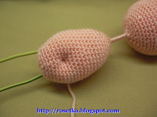 Вторую ногу обвязываем аналогично, после 5-й убавки по кругу. Обратите внимание – косичка из петелек, должна оказаться с внутренней стороны ножек, а не снаружи.