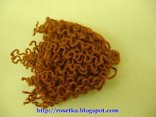 Вышиваем волосы ниткой от клубка. У меня это полушерстяная семеновская пряжа «Ольга». Делаем небольшие стежки – по линии кружочка хвоста, по нижней линии роста волос и.т. Продевать иголкой через внутреннюю деталь головы, делая большой стежок, не нужно. Нить потянет за собой наполнитель, да и расход нити увеличится.