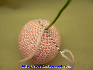 26р. 6 раз (А,х) = 12Сбн Наполнить деталь туловища. Наполнитель старайтесь распределять равномерно вокруг проволочного каркаса. 27р. 6 А= 6Сбн. Нить отрезать, оставив кончик длиной примерно 10см, отверстие стянуть иголкой швом «через край». Иглу продеть несколько раз по детали туловища, закрепив ей. Нить, немного натянув, отрезать – кончик спрячется внутрь.