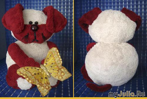 У меня сотворился Дружок... Не удивляйтесь - это вообще-то пёсик, хотя муж сначала его за медведя принял больно уж он упитанный получился...и совсем не такой, какой должен был быть по выкройке. Я думаю сыграла роль ткань; мягкая и эластичная.Свекровь просила от меня игрушку, ну вот, сваялся для неё Дружок Ростиком 20 см, может только сидеть