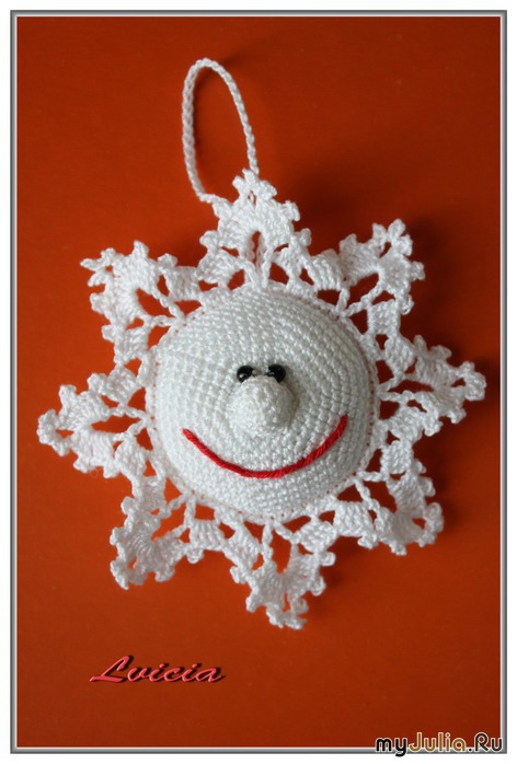 Примечание: обвязать снежинку можно любым понравившимся вам ажурным узором. В данном случае за основу взята вот такая схема: ![]() 3. Приклеиваем глазки, пришиваем нос и вышиваем рот. Рейтинг: +20 Отправить другуСсылка и анонс этого материала будут отправлены вашему другу по электронной почте. Последние читатели: |