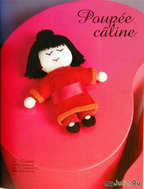 На куклу высотой 25см вам потребуется: по 1 моточку (даже по полмоточка хватит) ниток следующих цветов: - экрю (у меня белый - так драматичней) - черный - фуксии (малиновый) - красный - карри (оранжевый) 35 см ленты в тон, шириной 2,5см 15 см ленты того же цвета, шириной 1,5см Пряжа Jeans Yarnart ,спицы №2.5, 28п и 45р в 10см Перед Для правой ноги набрать 11п черной нитью, провязать лицевой гладью 8р, продолжить нитью цвета фуксии. На общей высоте 6,5см (провязав 20р цветом фуксии) вязание отложить. Левую ногу вязать так же, затем набрать 1п между ног, присоединить петли правой ноги и далее вязать на 23п. На общей высоте 16см (через 40 рядов после соединения ног) для формирования плеч закрыть с обеих сторон по 5п. Продолжить на центральных 13п цветом экрю, прибавляя в каждом ряду с обеих сторон следующим образом: 1 раз 2п, 4 раза 1п, 1 раз 1п через 4 ряда. Такая схема прибавок оказалась для меня невыполнимой, поскольку я не знаю способа прибавлять петли с обеих сторон в каждом ряду. Набирать новые получается только в начале ряда, но не в конце. Из протяжек - не аккуратно, тем более по две. Поэтому я вязала прибавки по следующей схеме: 1 ряд головы (лицевой)- в начале ряда набрать белой (экрю) нитью 2п, провязать ряд до конца - 15п 2 ряд - в начале набрать 3п, провязать до конца изн., - 18п. 3 ряд - в начале +2п - 20п. 4 ряд - в начале +2п - 22п. 5 ряд - в начале +2п - 24п. 6 ряд - в начале +1п - 25п. 7,8,9 ряды - без прибавок 10 ряд - в начале +1п - 26п. 11 ряд - в начале +1п. - 27п. Далее вяжем на 27п, на общей высоте 23см (провязав 24 ряда белой нитью без убавок) убавляем с каждой стороны в каждом втором ряду 1 раз 1п, 1 раз 2п, 1 раз 3п. Оставшиеся 15п закрываем в следующем ряду. Спинку вяжем так же, как перед. 45р на 10 см Рука (2шт.) Набрать 20п нитью цвета экрю, провязать 8р и перейти на нить цвета фуксии. Провязать 16р, петли закрыть. Лично я вязала руки по описанию, но если вы скорее склонны следовать логике, начните с цвета фуксии, а заканчивайте цветом экрю. Тогда можно будет в конце открытые петли просто собрать на нитку и стянуть, так как делать это при сборке все равно придется. Сборка Сшить перед и спинку по контуру, оставив отверстие для набивки (ножки внизу не зашивать, а собрать по кругу на нитку и стянуть). Набить. Лирическое отступление. Такие игрушки для самых маленьких по-французски называются дуду (doudou). Традиционно они делаются из чего-нибудь немохнатого, чтобы можно было кусать, и обычно набиваются не плотно, для мягкости. Зашить отверстие. Свернуть каждую руку трубкой, сшить по кромочным, низ собрать по кругу на нитку и стянуть. Набить. Обвязать нитью цвета экрю, чтобы получились кулачки. Хвостики нитей спрятать. Пришить руки к плечам. Волосы делаются так: нужно нарезать побольше нитей черного цвета, длиной ок. 16см, связать их в пучок на уровне 4см от края. Пучок пристроить на голове так, чтобы нити распределились по кругу, и накрепко пришить к макушке. Затем выстричь Калинке аккуратную челку, остальное подровнять в форме каре. Торчащие на макушке нитки оформить при помощи ножниц так, чтобы они выглядели, как половинка помпона. Вышить глаза и рот как на картинке. Обозначить нитями цвета экрю вырез башмачков. Платье Платье вяжется одой деталью, начиная с низа переда. Набрать 30п нитью цвета карри. Вязать 1см (6р) платочной вязкой, продолжить красным лицевой гладью. С каждой стороны убавить по 1п в 8 и 18 рядах (26п). На общей высоте 7,5см (провязав 12р без