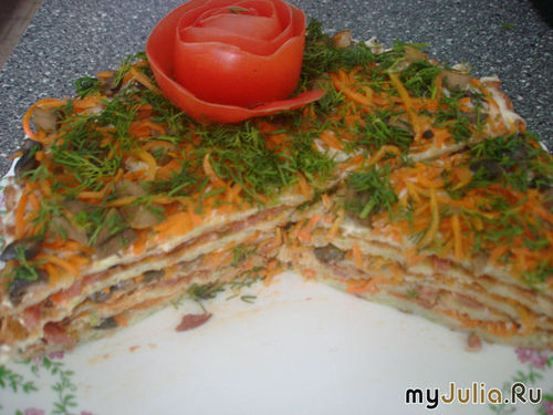 Ты знаешь, а я овощной закусочный тортик делаю иначе. Сама его и придумала, для разнообразия. Тоже очень хорошо получается, даже моя придирчивая мамуля и то оценила.