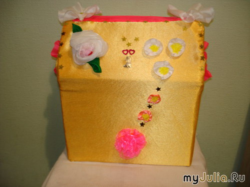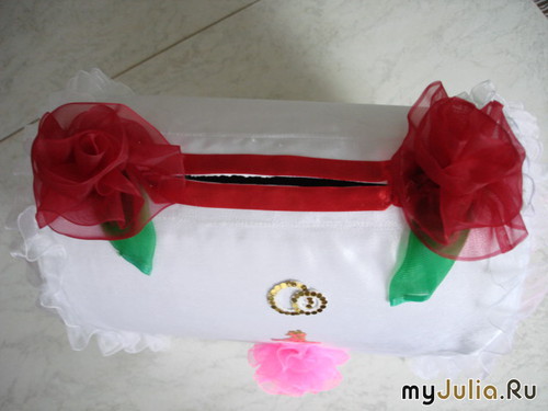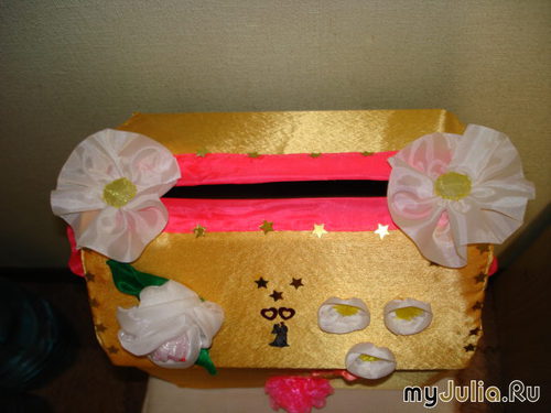 СВАДЕБНЫЕ ДЕНЕЖНЫЕ СУНДУЧКИ![]() ![]() ![]() Одна дама принесла мне жёлтый атлас.Я удивилась жёлтому цвету на свадьбу,но она мне ответила,что обожает жёлтый цвет.Так я сделала и жёлтый сундучок под деньги на свадьбу её дочери. ![]() ![]() За основу беру картонную коробку.Верхние закрывающиеся части отрезаю.Сверху приклеиваю вырезанный картон----крышу для домика,форму крыши применяю фантазию и по бокам вверху тоже картон приклеиваю. Затем обшиваю атласным материалом и украшаю цветами из лент и мишурой. Вот каюсь,что когда делала эти 2 сундучка,не сделала пошагового фото. Да я и не задавалась этой целью.А сейчас мне захотелось сделать похвастушки для вас мои читатели моего дневника. Надо же мне набрать как-то себе статус!!! ПОМОГИТЕ!!! Рейтинг: +7 Отправить другуСсылка и анонс этого материала будут отправлены вашему другу по электронной почте. |