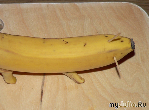 Чтобы сделать таксу, нужно: - 5 бананов, - нож, - зубочистки, - 2 бутончика гвоздики. Сначала у четырех бананов срезаем плодоножку с частью мякоти: Потом сделаем голову таксы. Для этого с двух сторон симметрично надрезаем кожуру в виде треугольников, начиная от плодоножки. Примерно 1/3 банана должна остаться целой. Отгибаем треугольники и срезаем всё, что находится между ними: Справа и слева симметрично и по возможности одинаково вырезаем овалы или миндалинки – глаза: Из гвоздики делаем зрачки: Лапки и голову прикрепляем к туловищу с помощью зубочисток. Голова тяжеловата, чтобы она не упала, снизу крепим еще 1-2 зубочистки. Вот собачка и готова, ее даже можно покормить! Рейтинг: +19 Отправить другуСсылка и анонс этого материала будут отправлены вашему другу по электронной почте. |