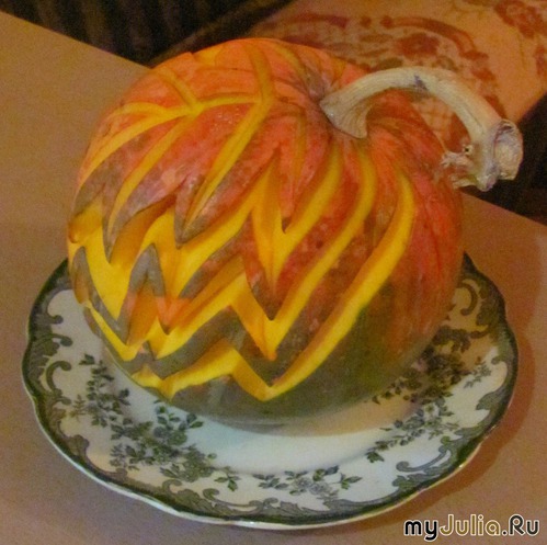 Техника резки своеобразная, как бы "рубленная", нарочито-небрежная, а смотрится красиво... Жаль, тыковки у меня не такие уж "фактурные", контраста между кожицей и "внутренностью" маловато. Вышло как-то так...