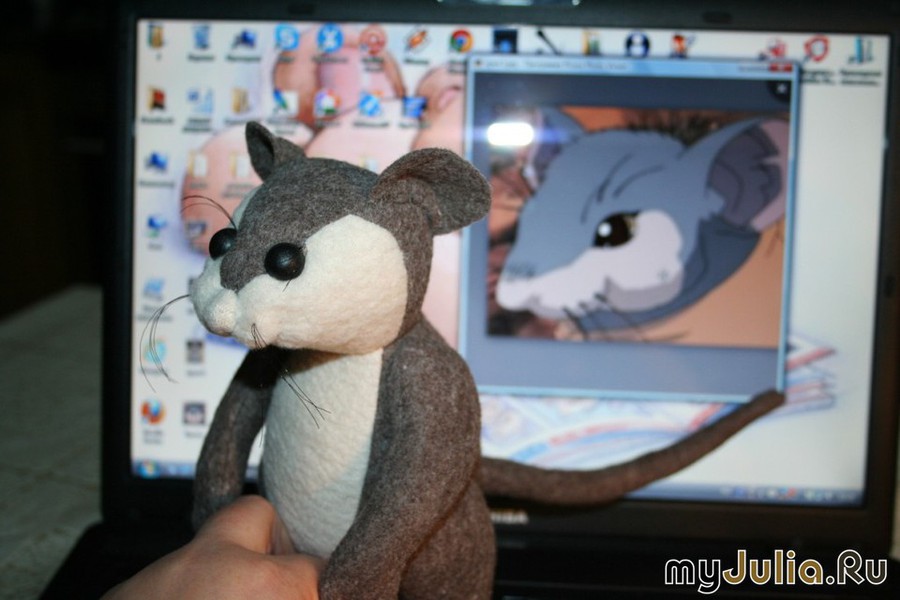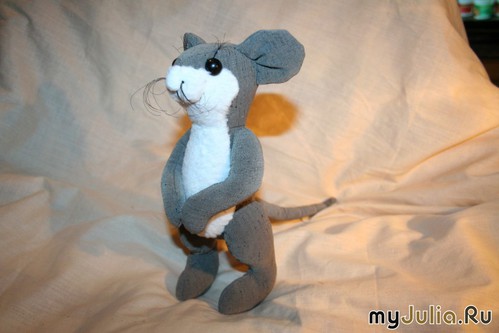 У мышки первоисточника - голова как бы расширяется к шеё, а у тебя наоборот. Мыш нарисованный - такой щекастый, заевшийся. Мне каэца, что голова у игрушки должна там где по идее шея - быть шире, чтоб собрать на нитку. Тогда щёки будут такие вот надутые. Это только мне так каэца