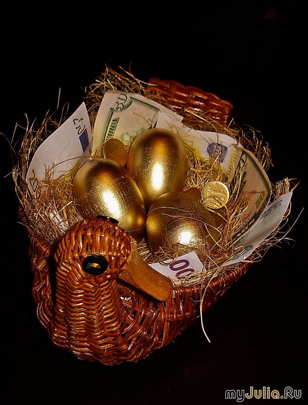Ну вот, мой утято-гусято-курятник разросся еще на один золотонесущий экземпляр. Этот вариант мне понравился больше всего. Для разнообразия добавила немного золотых монеток.