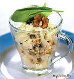 Он был неклассический - с курицей, но зато с главными составляющими : сельдереем, яблочками и орешками, а также с виноградом, с сырно-йогуртовой заправкой. Мммм!
