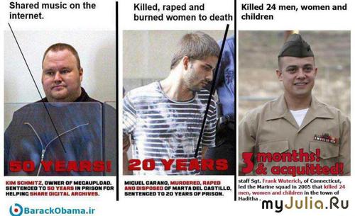 1. Ким Шмитц помогал людям обмениваться файлами. 2. Мигель Карано убил, изнасиловал и сжёг женщину. Приговорён к 20-ти годам тюрьмы. 3. Сержант Фрэнк Вутерич участвовал в расстреле 24 безоружных мужчин, женщин и детей. 23 января этого года приговорён к 3 месяцам тюрьмы, но из-за процедурных особенностей он не будет его отбывать этот срок. Что на самом деле является ценностью?!?! все вокруг денег... ведь 1. Хозяин Мегаплойда покушался на чужие деньги - деньги ценнее жизни. 2. Убийца и насильник покушался на женщину - он ей платить не хотел. 3. Стаф Сержант выполнял поставленную задачу - он за это еще деньги получает. (((((((((((((((((((((((((((((((((((((((((((((((((((((( Рейтинг: +7 Отправить другуСсылка и анонс этого материала будут отправлены вашему другу по электронной почте. |