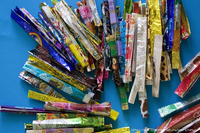 Опять же из шкодности процесс решила поснимать и представить в фотографиях, вдруг вам тоже захочется вспомнить детство или будет жалко выбросить фантики! Итак, приступим. Фантики подойдут любые, лишь бы вам нравились.