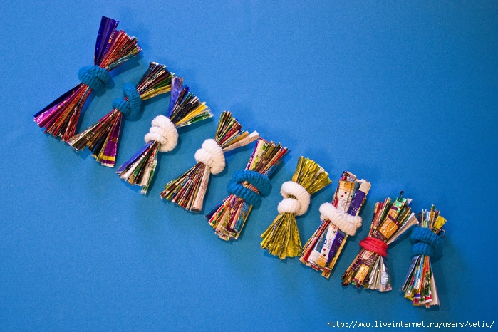 Теперь нужно разложить фантики по размеру (я воспользовалась резинками для волос, чтобы они не рассыпались).