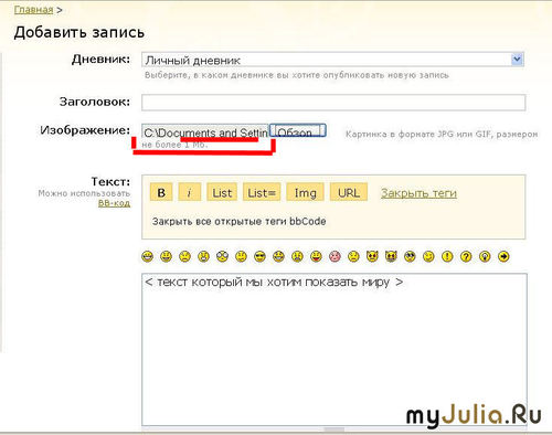 Текст с картинкой в оглавление. Вот так Что нам надо сделать Открыть (например) дневник и написать текст Кликнуть левой кнопкой мышки на «Обзор» У нас появится окно 1. Выбираем зону (на пример «рабочий стол»), в которой у нас находится папка, из которой мы будим вставлять картинку, кликаем на неё левой кнопкой мышки и у нас открывается поле с папками. 2. Выбираем папку, кликаем левой кнопкой мышки 2-раза по папке и она откроется Выбираем рисунок, который будим вставлять, кликаем по нему левой кнопкой мыши 2-раза И в поле обзор появится путь, из которого рисунок идет в наш текст. Далее кликаем на «Предпросмотр» У нас загружается страничка «Предпросмотра» И видим наш текст и в шапке текс наша картинка. Кликаем на «Опубликовать» И не забываем о объеме загружаемого файла, не более 1 Мв Рейтинг: +7 Отправить другуСсылка и анонс этого материала будут отправлены вашему другу по электронной почте. |