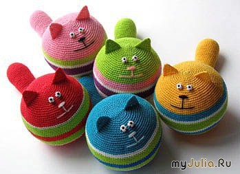 шар для сухого бассейна окружность 22см нитки хлопок 100%"Жасмин" Туловище: Обвязываем шар 1.4вп замкнуть в кольцо 2.6ст 3. 2ст в кажд петлю=12 4.2ст в одну петлю, 1ст=18 5.2ст в одну петлю, 2ст=24 6 2ст в одну петлю,3ст=30 7.2ст в одну петлю, 4ст=36 8.2ст в одну петлю, 5ст=42 9 2 ст в одну петлю,6ст=48 10 2ст в одну петлю,7ст=54 11-14р 54ст 15р-24р 54ст других цветов 25 из2ст-1,7ст=48 26 из2ст-1,6ст=42 27 из2 ст-1,5ст=36 28 из 2ст-1,4ст=30 29 из2ст-1,3ст=24 30 из2ст-1,2ст=18 31 из 2ст-1,1ст=12 32 из 2 ст-1=6 Уши 1 ввязать 7ст, оставив нить для обвязки(те привязываем нить к месту начала уха и оставляем длинный конец для дальнейшей обвязки, а другой конец вяжем) 2. во 2 петлю ст, 3ст, последние 2 ст вместе=5ст 3 во 2 петлю ст, 1ст, последние 2 ст вместе=3ст 4 во 2 ст. 2ст вместе=1ст обвязать нитью, которая осталась у основания(при необходимости протянуть ее под ухом, чтобы обвязка была спереди) в самый верхний столбик сделать 3стбн Хвост 1. 4вп замкнуть в кольцо 2 6ст 3 2ст в 1 петлю=12 4 2ст в одну петлю, 1 ст=18 5-7р 18ст 8-17ст 9-16ст 10р-15ст 11-14ст 12-13ст 13-20р-12ст Хвост туго набить синтепоном и пришить к коту ,вышить мордочку, пришить глазки Рейтинг: +13 Отправить другуСсылка и анонс этого материала будут отправлены вашему другу по электронной почте. |