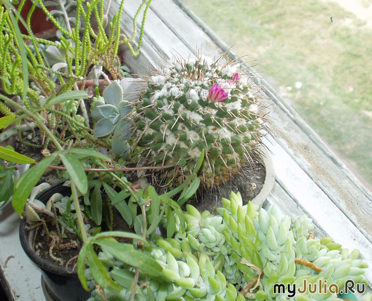 Этот красавец появился у меня совсем случайно - мама дала "кусочек" - вроде бы должен цвести. Как оказалось - да, цветет, причем с завидной регулярностью - каждую весну. И долго. Маленькими красными цветами. К тому же они раскрываются днем и закрываются на ночь. Мой кактусик на фоне остальных сукулентов. Там видна эчеверия, очиток "ослиный хвост" (если я не ошибаюсь) и толстянка (крассула) - это та, похожая на траву.