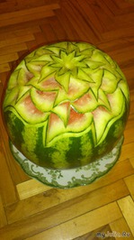 Этим узором я "заболела" еще в прошлом году (думаю, Леночка помнит - я ее доставала! ). В оригинале была использована тыква. И вот, когда я практически разобралась, что к чему... Тыквы в доме не оказалось! Резала по арбузу...)))