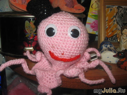 Сидела я как-то на работе и бездельничала. Заказов мало. Я с ними быстро справилась, а больше и делать нечего. Начатое пончо я в спешке утром забыла дома. Благо крючок всегда со мной и нитки остались с прошлого раза.Решила я связать давно планируемую куклу. Начала вязать головку. Хотела чтобы она получилась не круглая, а немного вытянутая. И чтобы без отрыва перейти на туловище. Голову связала, а с плечиками увлеклась, и получились они очень уж волнистыми. Посмотрела я на это дело и вспомнилась песенка из мультика "Палка, палка,огуречик. Вот и вышел человечек. А еще добавим ножек, получился осьминожек". Вот и получился мой осьминожек. Дома я приклеила ему глазки и вышила ротик. Но для полноты образа чего-то не хватало. Так появилась шляпа. Если кому-то интересно связать такое, то расскажу. Начинаем вязать круг с 2 в.п. 1 р. 6 ст. б/н 2 р 12 ст.б/н 3 р. 18 и т.д. пока не покажется нужного размера. Затем делаем убавления. Вначале раз 6 с двух сторон симметрично. Затем как обычно когда вяжем шарик. Т.е 6 раз в каждом ряду. Когда останется 6 столбиков, провязываем 3 ряда. Это будет шейка. Затем делаем осьминожью "юбочку". В зависимости от размера игрушки добавляем в каждом ряду столбиков по 8. Когда "юбочка" готова, начинаем вывязывать ножки, всего их 8. Делим "юбочку на 8 частей. Нужно учесть, что каждая ножка займет 2 столбика. Не отрывая нитки вяжет 15-17 в.п. и обвязываем их столбиками без накида в обратном направлении. Дальше продвигаемся ст.б/н по юбочке до следующей ножки и повторяем. Набиваем синтепоном или ватой "голову-туловище" и зашиваем. Шляпка тоже очень просто вяжется. 2 в.п 1 р. 6 ст. б/н в первую петлю 2 р 12 ст.... 3 р 18 4 р 24 5 р 30 6 р 30 ст б/н за предыдущий ряд (чтобы получилась кромочка) 7 р 30 8 р 24 9 р 30 10 р. 36 ст. б/н Для донышка шляпы вырезать и вставить кусочек плотного картона. Шляпку пришить. Глазки и ротик можно сделать любые. Сын сказал, что моему Мистеру Осьминогу не хватает тросточки. В планах у меня связать целое семейство. Так что, если кто-то захочет, то смогу сделать МК. Рейтинг: +27 Отправить другуСсылка и анонс этого материала будут отправлены вашему другу по электронной почте. |