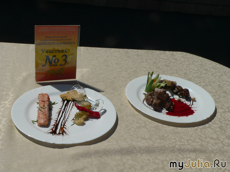Если по порядку, то в 7.20 в Ростов прибыл поезд «Кишинев-Адлер» и привез он Лилю. За неспешными разговорами в кафешке мы дождались открытия магазинов, промониторили операторов сотовой связи и отправились на главное мероприятие дня – чемпионат по барбекю Ростовской области, который проходил в ресторане «Рандеву» в селе Чалтырь, это совсем рядом с Ростовом. Об этом событии мне рассказывали в нашем департаменте потребительского рынка еще в марте. Сначала – в общих чертах: мол, будет такой чемпионат, потом – с подробностями. Подробности вот какие. Подобный чемпионат у нас в области проводится впервые. Раньше были фестивали, где повара готовили что-то и угощали гостей, а теперь участие в чемпионате стало интересным, добавился элемент азарта и серьезности. Нужно было не просто приготовить рыбу, мясо и десерт, но и удовлетворить строгий вкус жюри. Вы спросите: почему же раньше не проводили такие чемпионаты? А потому что приготовление барбекю относится к высокой кухне, и у нас было мало таких специалистов, но прошлогодний фестиваль показал, что Ростовская область уже готова к проведению чемпионата. Не особо надеясь на успех, организаторы пригласили поучаствовать в нашем чемпионате Виталия Лапинского (Днепропетровск, Украина), и Виталий согласился. Таким образом благодаря нашему коллеге-карвингисту областной чемпионат сразу же приобрел статус международного. Лиля приехала поддержать земляка. К началу мы, конечно, опоздали (честно скажу, не особо и стремились). Но зато когда появились – неожиданно для Виталия, приободрили нашего конкурсанта, жарившего ананасы для десерта: «У меня есть болельщики! Прямо второе дыхание открылось!» - воскликнул Виталий. Отвлекать повара от работы долго мы не посмели, поэтому пошли фотографировать уже приготовленные блюда. Судья Сергей Насхулиян помог отыскать работу Виталия: «Где карвинг-цветок из огурца, там и его работа»: Услышав волшебное слово «карвинг», я стала искать хоть какие-то его элементы в оформлении блюд: Задержалась у рыбы в кисло-сладком соусе, ведь я такую готовила, и она мне прямо как родная )))) Обрадовалась, увидев силуэты ножа и вилки, которые показывала нам когда-то Юля Рожкова: Лиля оценивала работы с точки зрения повара, обращая внимание на подачу и общее оформление. Ей понравилось барбекю на досках и в сковородке. Разумеется, после того, как Виталий закончил свое выступление, мы немного поговорили о своем, о карвинговом. И из этой беседы последуют оргвыводы. Через недельку ждите, у меня есть для вас интересное предложение!