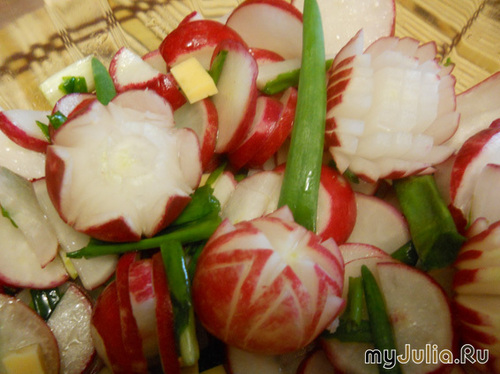 Честно признаюсь, что ручки у меня кривые, потому как если что-то резать, то нужно это делать постоянно и... пока не получится. Но лень раньше меня родилась, а, впрочем, не лень... Я не могу делать что-то одно. То декупажить тянет, то куклу пошить, то связать, то порезать, а то и... Да мало ли куда я могу приложить свои шаловливые ручки))). Да, порезать редиску хотелось давно. И по многим причинам. Во-первых, ее много. Во-вторых - разного размера и формы. В третьих, режется легко даже с учетом отсутствия нормальных ножей. Так что в один прекрасный день... или не очень прекрасный... Точно знаю, что было солнце и ветер, а значит, для желания "что-то испортить" - самое то. Так вот, в этот день была сделана очередная попытка "что-то порезать". В результате получился лотос. Чесслово, был лотос. Ну никак я его нормально сфотографировать не смогла. Здесь вроде как попытка вырезать тюльпан, хризантему и все же лотос лучше видно))). Здесь - тюльпан, нечто странной формы (но мне понравилось) и хризантема. А на сей фотке, если присмотреться, конечно))), виден даже мой любимый цветочек-звездочка, который у меня получается почти всегда. Мама была в шоке, когда я из банальной "розочки" (ну это когда просто пополам зигзагом разрезать) такое изобразила. Это была очередная кривая попытка вырезать лебедей. Могу признаться, что предыдущие были еще хуже))). А еще в один прекрасный день, я купила нож-точилку. Долго ходила вокруг него ибо размер устрашающий, но потом решилась. Пока еще не сообразила, как "точить", чтобы было аккуратнее, но попытку сделать розочки из редиса и огурца уже были. Мужжж вдохновился. Можете критиковать))) Рейтинг: +26 Отправить другуСсылка и анонс этого материала будут отправлены вашему другу по электронной почте. Последние читатели: |