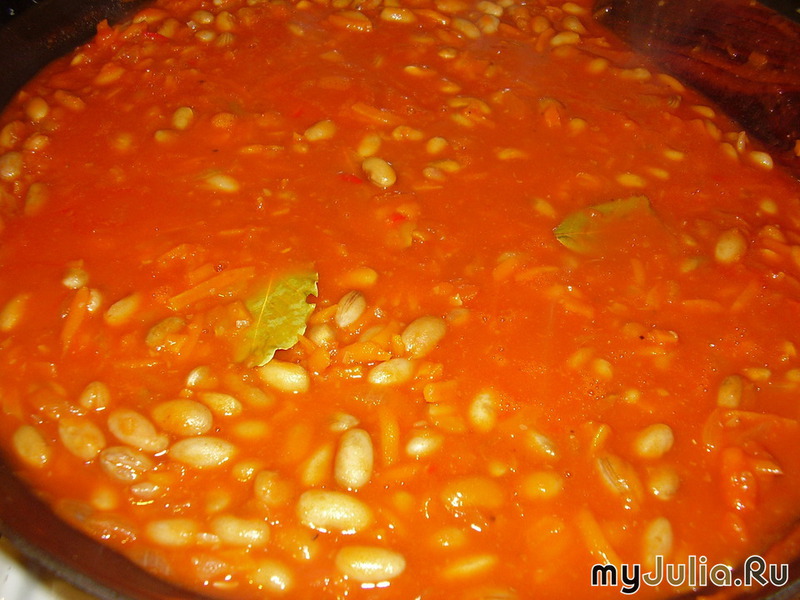 В этом году у меня довольно большой урожай.И фасоль в том числе удалась.Решила сделать заготовки из фасоли на зиму.Собрала,почистила,и муж помогал.За это для него,как любителя фасоли в томате,сделала именно так,в томате. Пока фасоль свежая,легко и быстро варится,не надо вымачивать.Итак:к отварной фасоли добавила лук,морковь,немного свежего чили перчика.Обжарила слегка в большом казане на растительном масле.Добавила томатной пасты,воды,соли,сахара.В конце варки пару листиков лаврового листика присоединились к весёлой компании.