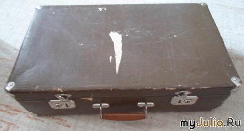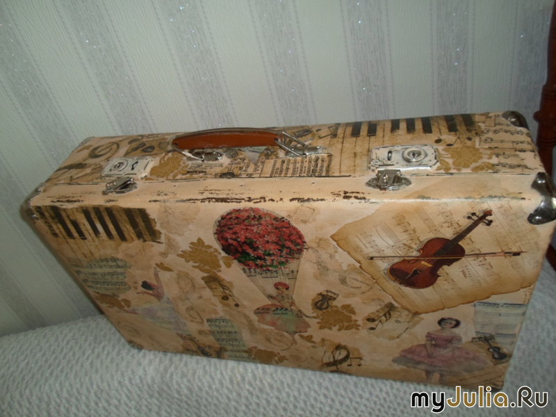 На ковре из жёлтых листьев В платьице простом, Из подаренного ветром крепдешина, Танцевала в подворотне осень вальс-бостон, Отлетал тёплый день и хрипло пел саксофон. (Александр Розенбаум) Признаюсь: я немного плюшкин, с маленькой буквы, над закромами не чахну, охотно делюсь творческим материалом и идеями. Но вот выбросить что-нибудь, руководствуясь фен-шуевскими рекомендациями - для меня тяжело выполнимая задача. То, что для среднестатистического человека является мусором, для меня – творческий материал. Очень давно мечтала я разжиться где-нибудь старыми чемоданами, кинула клич по знакомым, но чаще всего слышала в ответ: «Ой, надо же, долго валялся, но на днях выбросили…» Вот так всегда… Разместив в местной газете объявление: «Куплю недорого старый чемодан», приютила несколько штук под кровом дома своего. В моей стране Чемодании живут уже пять отреставрированных-отдекорированных жителей. Расскажу об одном из жителей моей страны Чемодании, о жителе с осенним настроением. В своё время этот ветеран советского легпрома пополнил сообщество БОМЖей. Наша встреча случилась, когда он одиноко лежал у мусорного контейнера, припорошенный снегом, а его металлические уголки зазывно поблескивали под солнечными лучами сквозь снежное покрывало, как металлические зубы среднестатистического БОМЖа…Я возвращалась с лыжной прогулки и распознала в неясных очертаниях сугроба свою маленькую чемоданную мечту, вернее, одну из них. Конечно же, я подобрала и обогрела… И наполнила музыкой души. Вот он, чемодан, слегка потрепанный бытиём, но не утративший жизненный стержень и характер. Рабочие, исправные замки, надежные металлические уголки, сохранившаяся осанка. Внутри – как новенький, даже свидетельство о рождении сохранилось: Могилевское Управление Местпрома Галантерейная фабрика г.Бобруйск Наимен. Изделий Чемодан Размер 60 Сорт 1 Артикул 187-БЛ Прейскурант 109-03-42 Цена 4 руб. 60 коп. Дата выпуска (не указано, жаль) ГОСТ РТУ БССР 376-64 Общая идея декора родилась благодаря наличию в моих запасах бумажных трехслойных салфеток на музыкальную тему – давно искала им применение. Всё остальное подбирала постепенно, иногда спонтанно, прямо в процессе работы. Чемодан мой и по настроению и по цвету получился «осенний»: много музыки, чуть-чуть грусти, ощущение зрелости, природные приглушенные тона охры, терракоты, бронзы, горчицы, болотной зелени. Образы, навеянные танцем листьев, утренними туманами, летающей паутинкой, нахохлившимися воробушками, мечтающими перезимовать… Итак, превращаю БОМЖа в полноправного жителя страны Чемодании. Вымыла чемодан снаружи и внутри, высушила. Зашпаклевала неровности и «запломбировала кариес» пломбой из папье-маше с добавлением клея ПВА. По ребрам жесткости натерла чемодан свечой, чтоб в этих местах позже создать искусственные «потертости» при окраске. Вот так выглядел чемодан после того, как прошлась наждачкой по ребрам. Загрунтовала, а вернее, покрасила наружную и внутреннюю поверхность чемодана бледно-бежевым тоном. Пользовалась акриловой краской на водной основе из строительного магазина. Пришлось наложить на наружную поверхность три слоя краски с промежуточной сушкой, чтоб получить ровный тон. Использовала валик, губку и кисть. На внутреннюю часть хватило двух слоёв краски, в принципе, у меня не было стремления полу