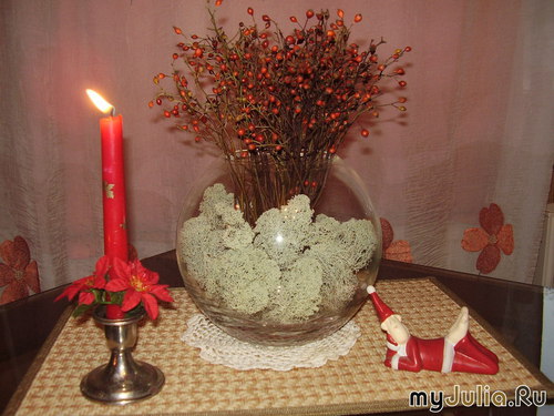Простыми приёмами можно украсить интерьер своего дома к зимним праздникам.Природные материалы самые надёжные в этом деле помощники,и не требуют ни каких затрат.Осень в этом году затянулась у нас,снега нет,довольно тепло.Прогулялась в лес и собрала мох,вереск и даже бруснику.В ход пошли веточки шиповника с плодами. Венок сплела из плетей дикого винограда,который мы обрезаем каждый год,что бы не сильно разрастался.Просто длинные побеги скрутила в кольцо и потом перекрутила по самому кольцу.Веточки примотала ниткой,подходящей по цвету. Подвязала красную ленту для нарядности.Рождественский венок готов,можно повесить в доме или на входной двери. В композициях для декора комнат так же применила природные материалы,сухие цветы.Зажгла свечи,глазу приятно,настроение поднимается в это тёмное время года. Или так. И такой вариант,с круглой стеклянной вазой.Внутри высушенный мох. Желаю всем творческих успехов!